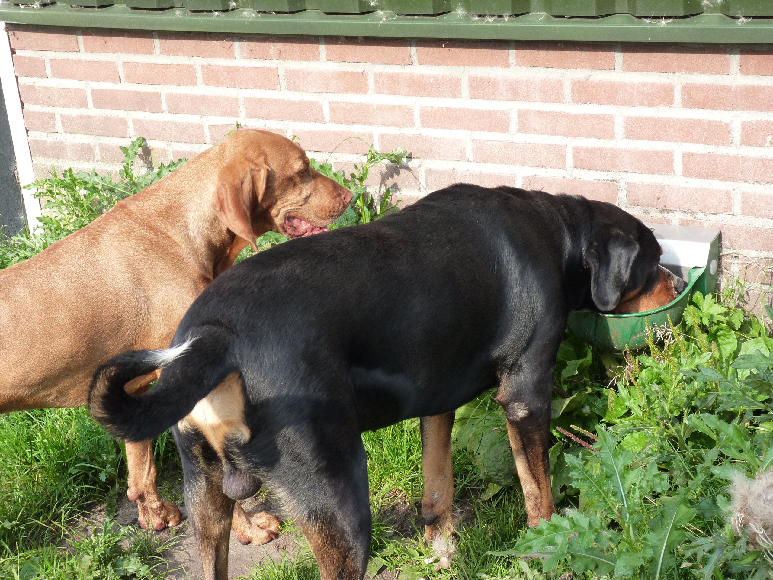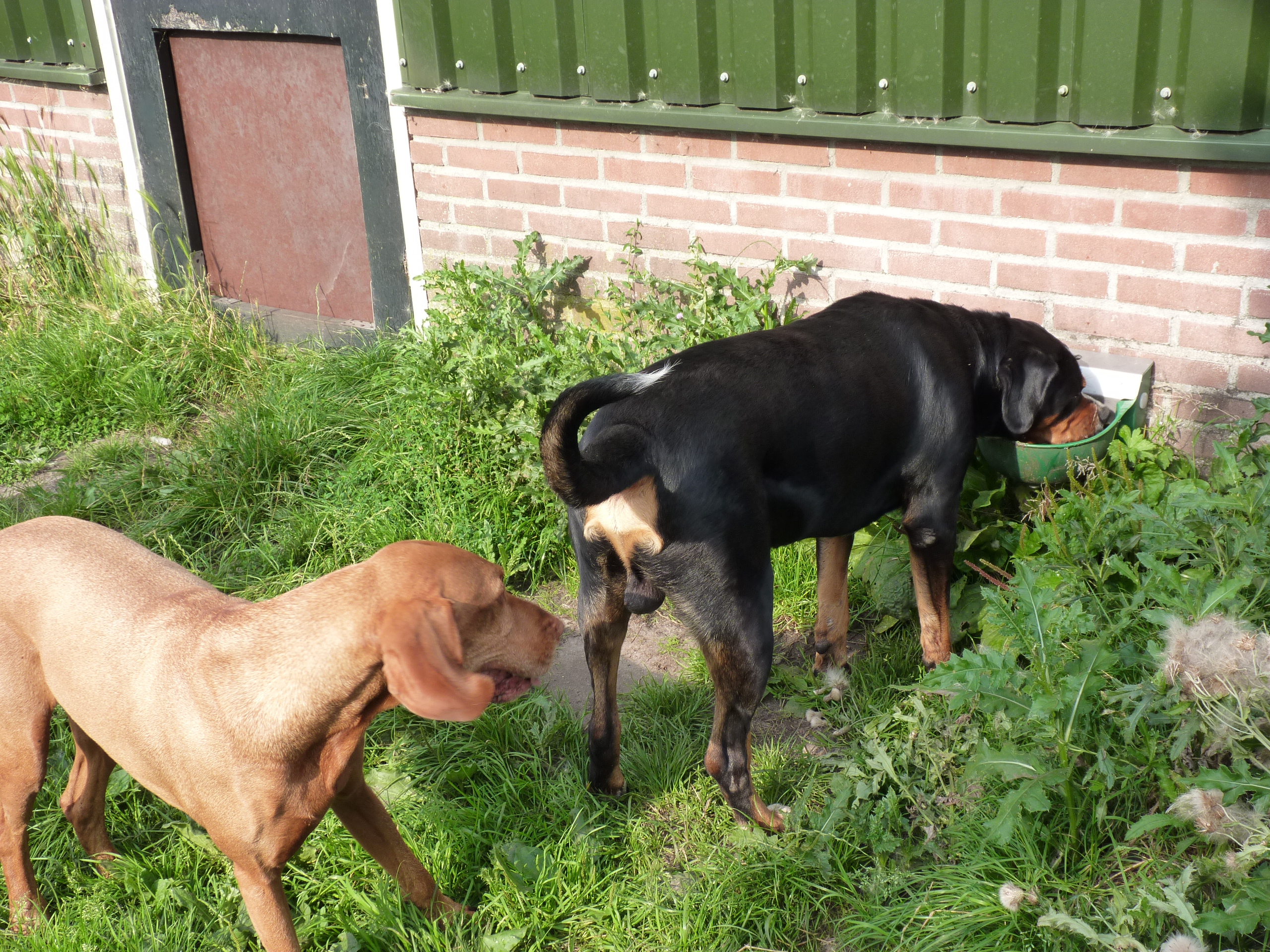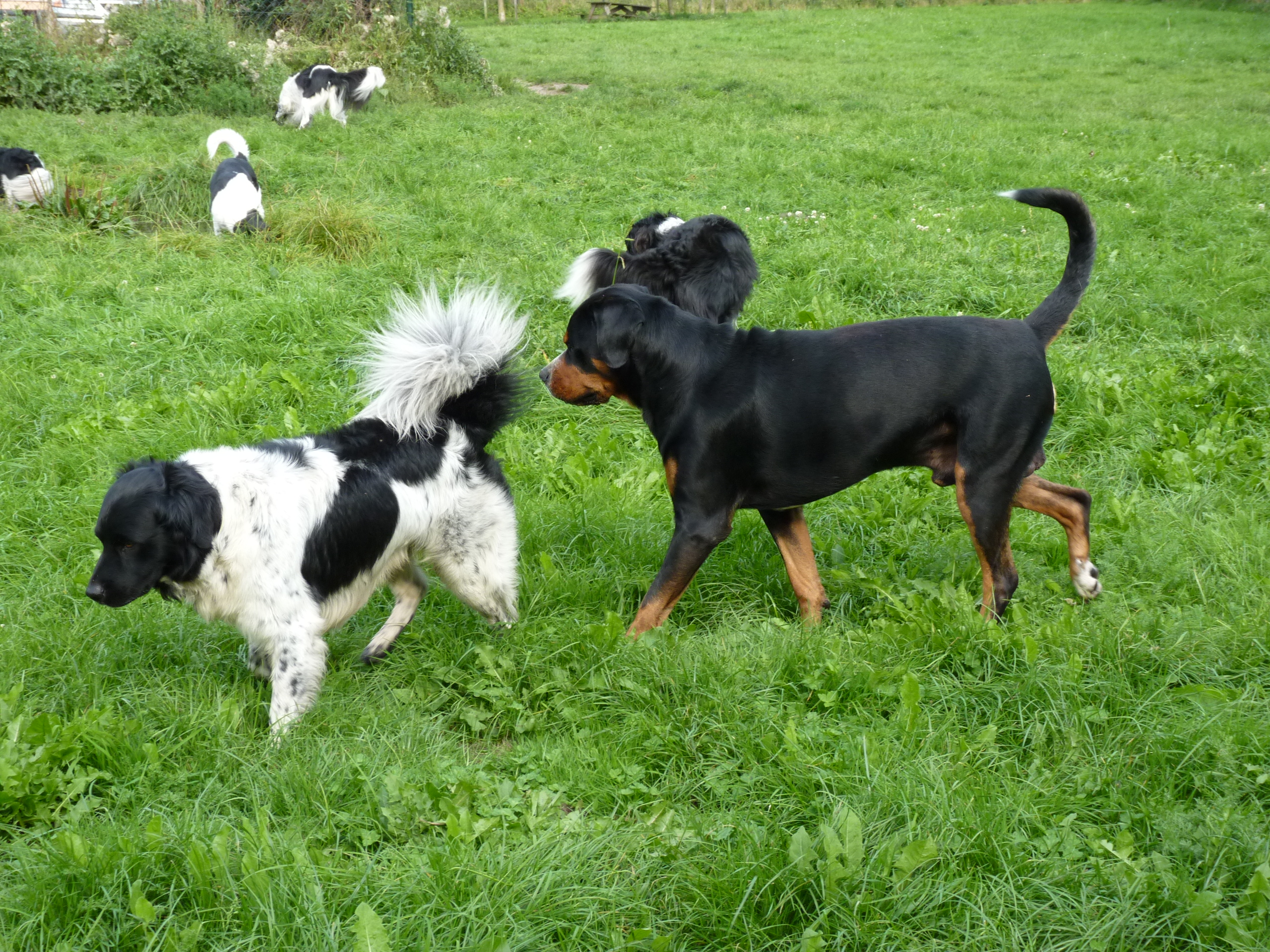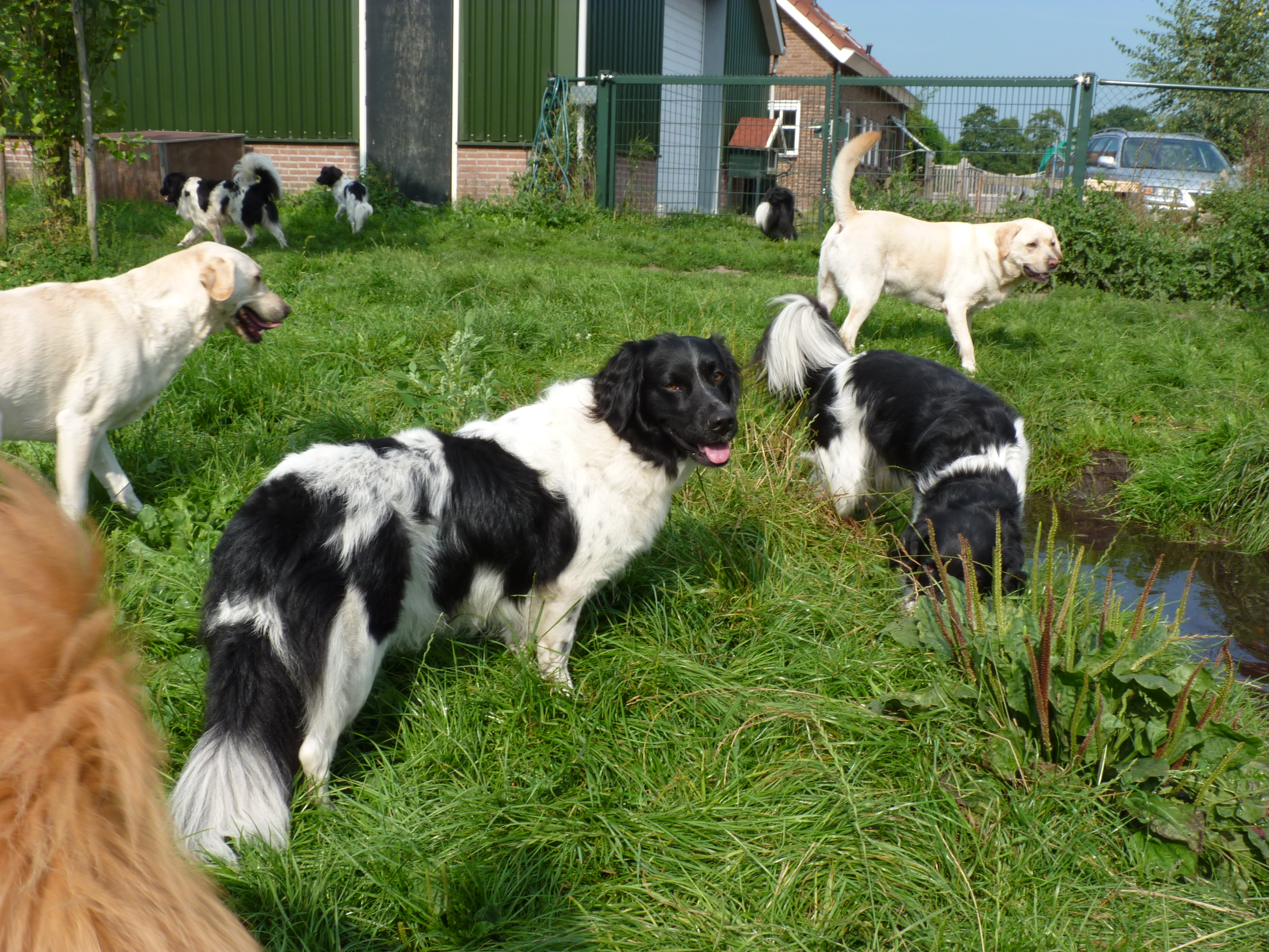 Het is nog steeds 'vol' en dat betekent dat er een flinke roedel loopt. Er logeren erg veel Friese Stabij's die graag samen optrekken. De Friese heren Roefke, Sybe en Jebbe hebben eerst een paar dagen vervelend om elkaar heen gedraaid, de grote vraag blijft wie van hen de baas mag zijn. Vandaag kwam Chef, de ongecastreerde Zwitserse Sennen binnen en de vraag bestond niet meer. Af en toe zoekt Chef de heren op om ze even intimiderend aan te staren en dan druipen ze af...ok...ok...jij bent 'm.