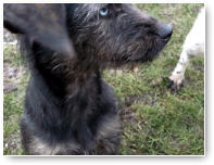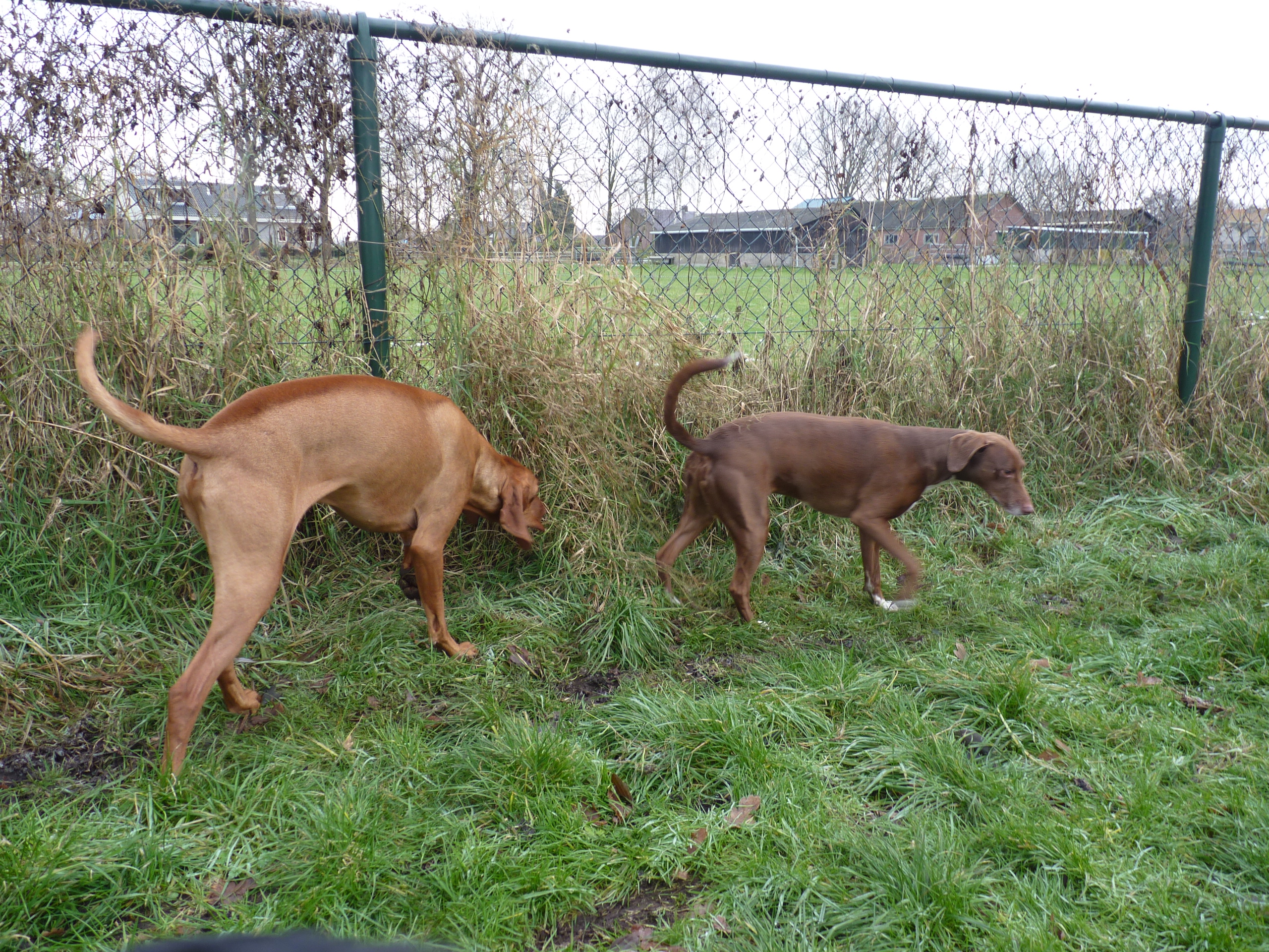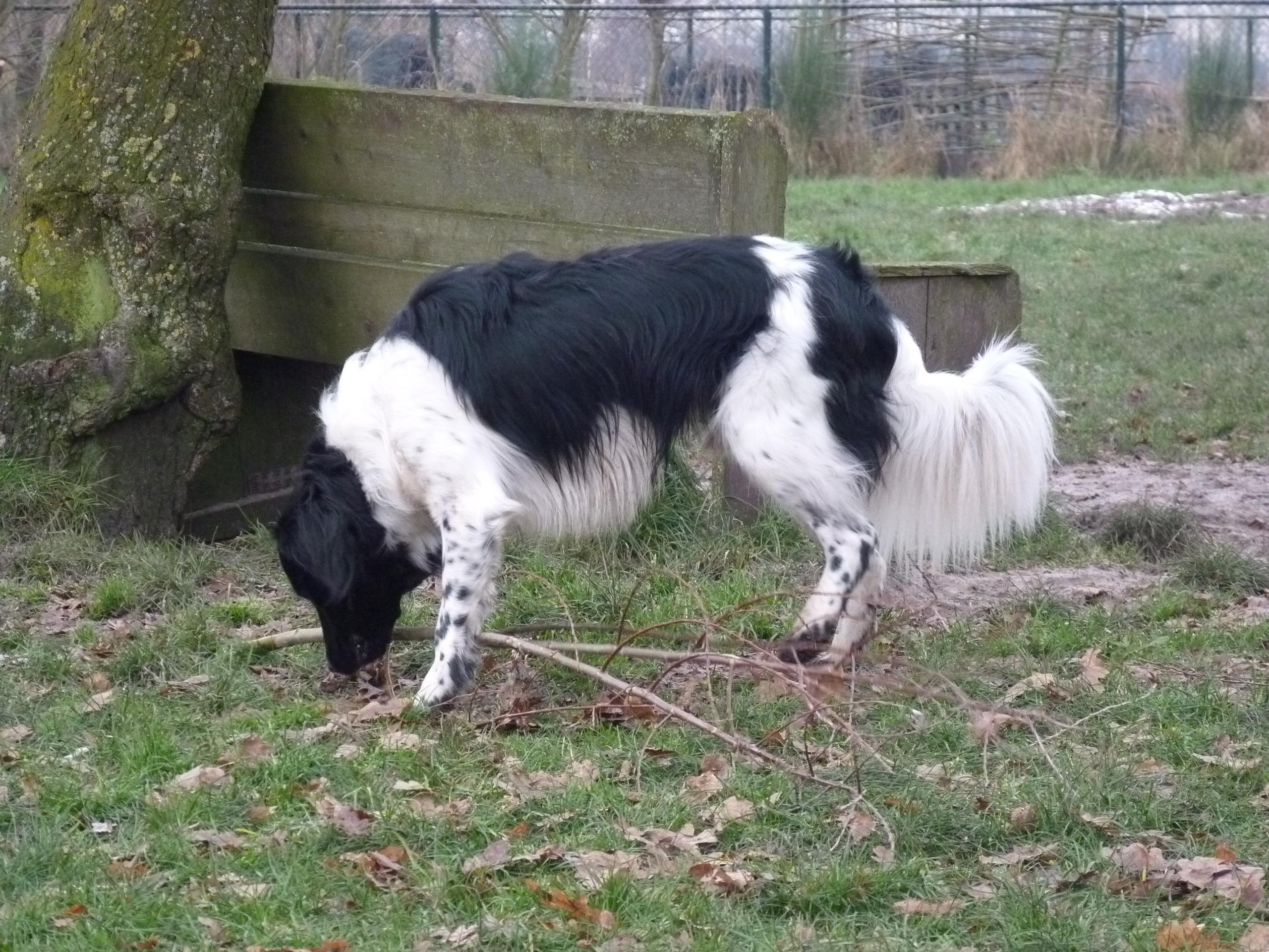 Typisch. Sam tilt z'n poot op en loopt weg. Joris snuffelt en tilt op dezelfde plek ook z'n poot op.