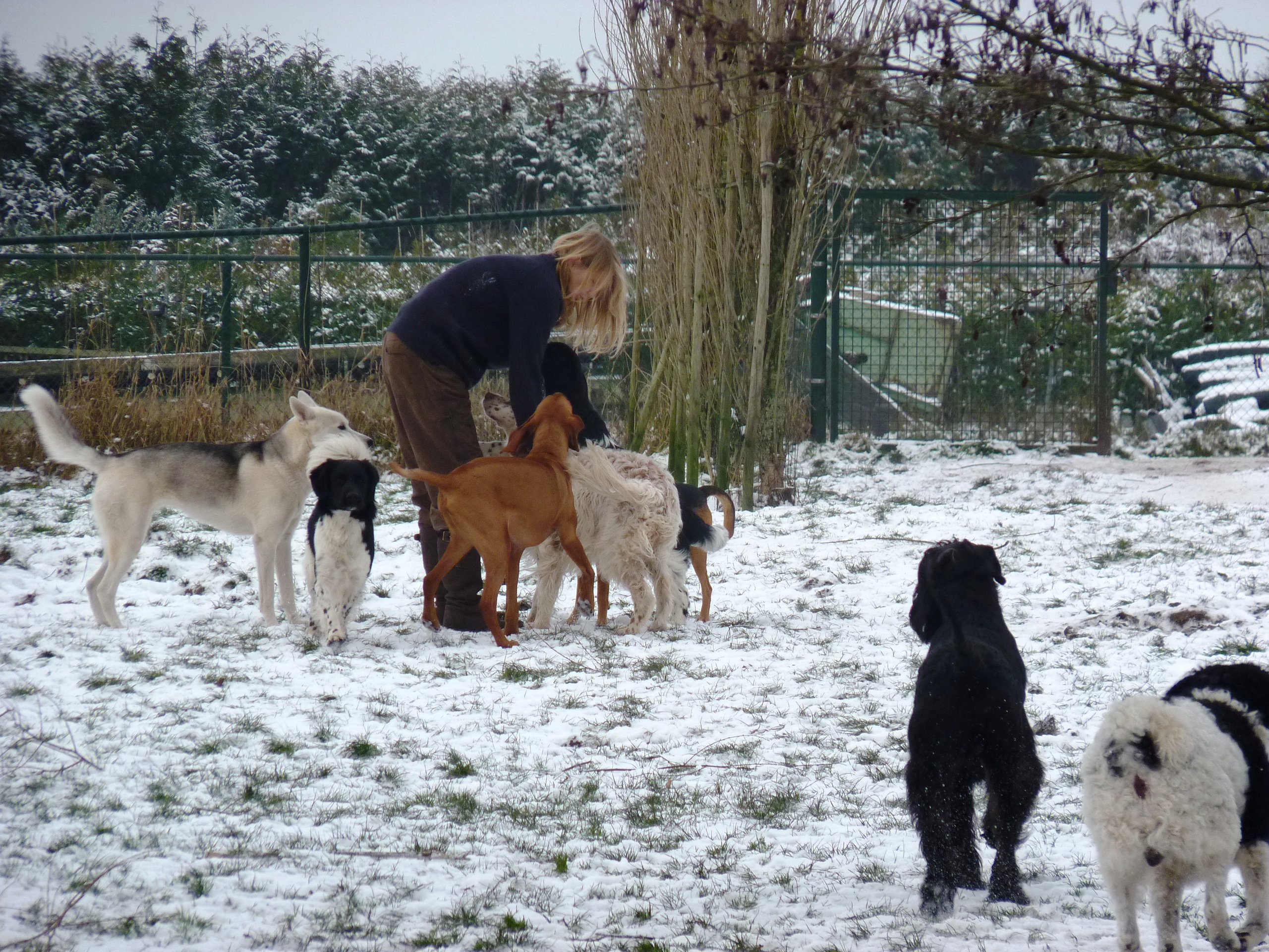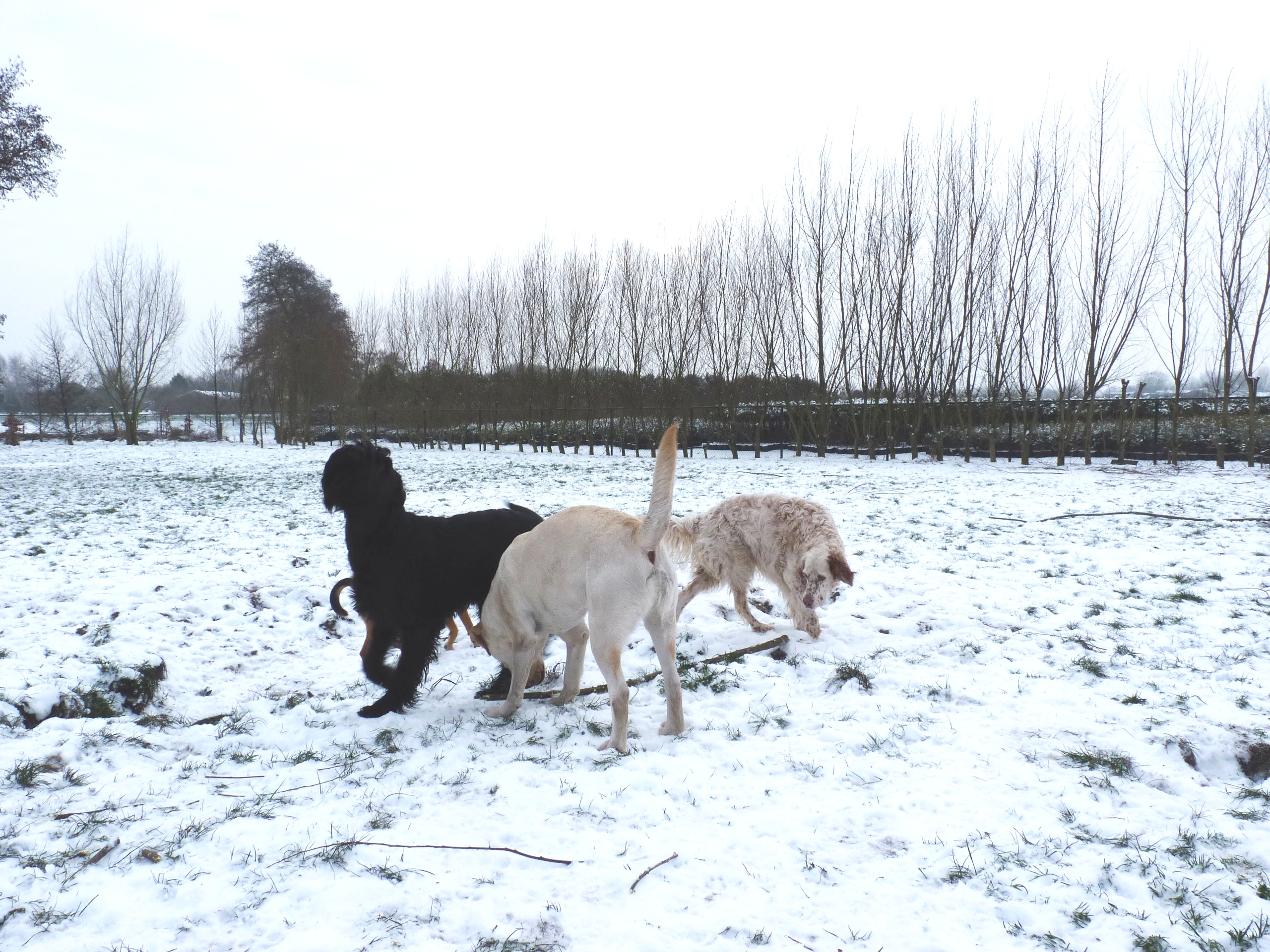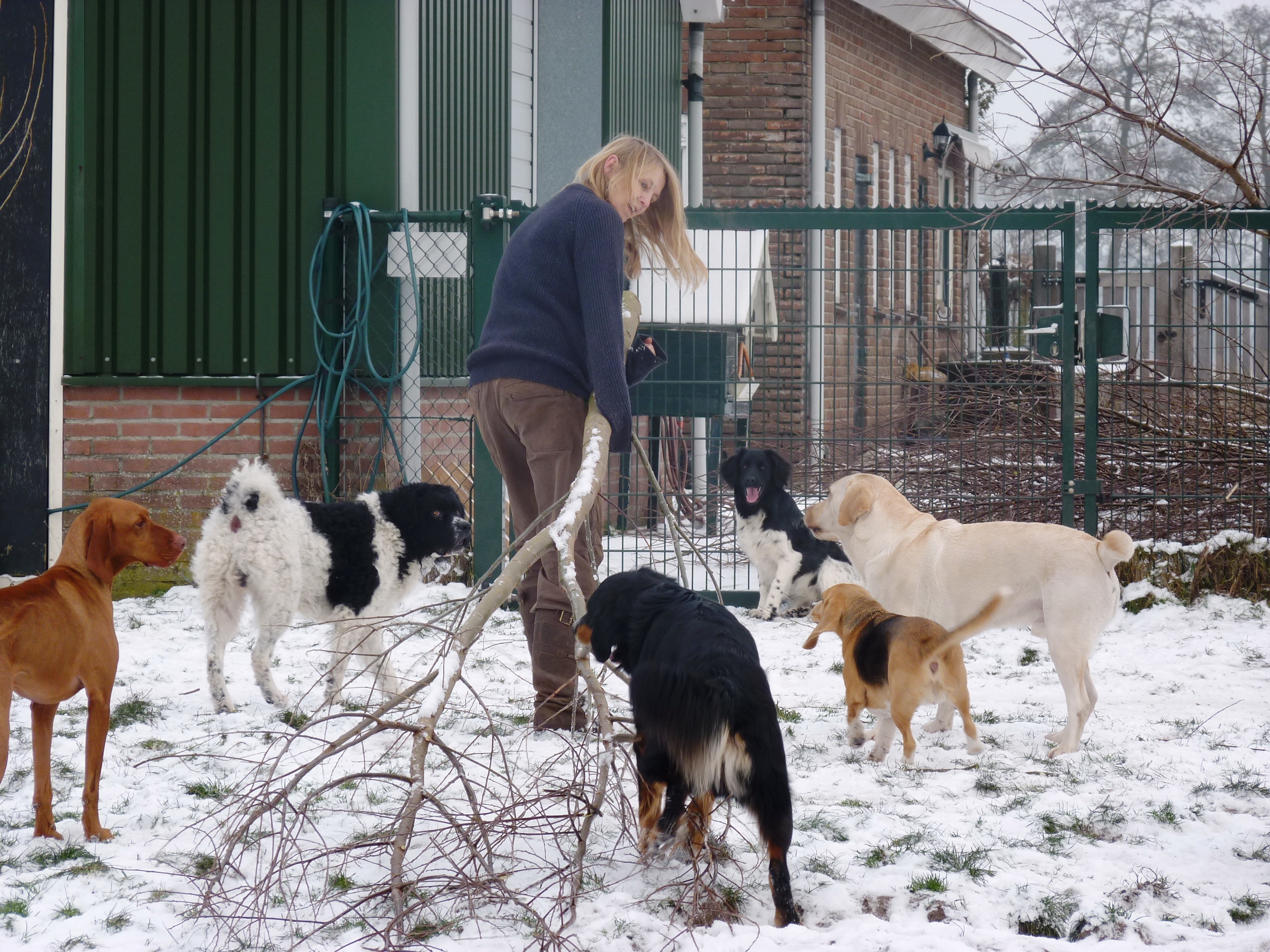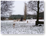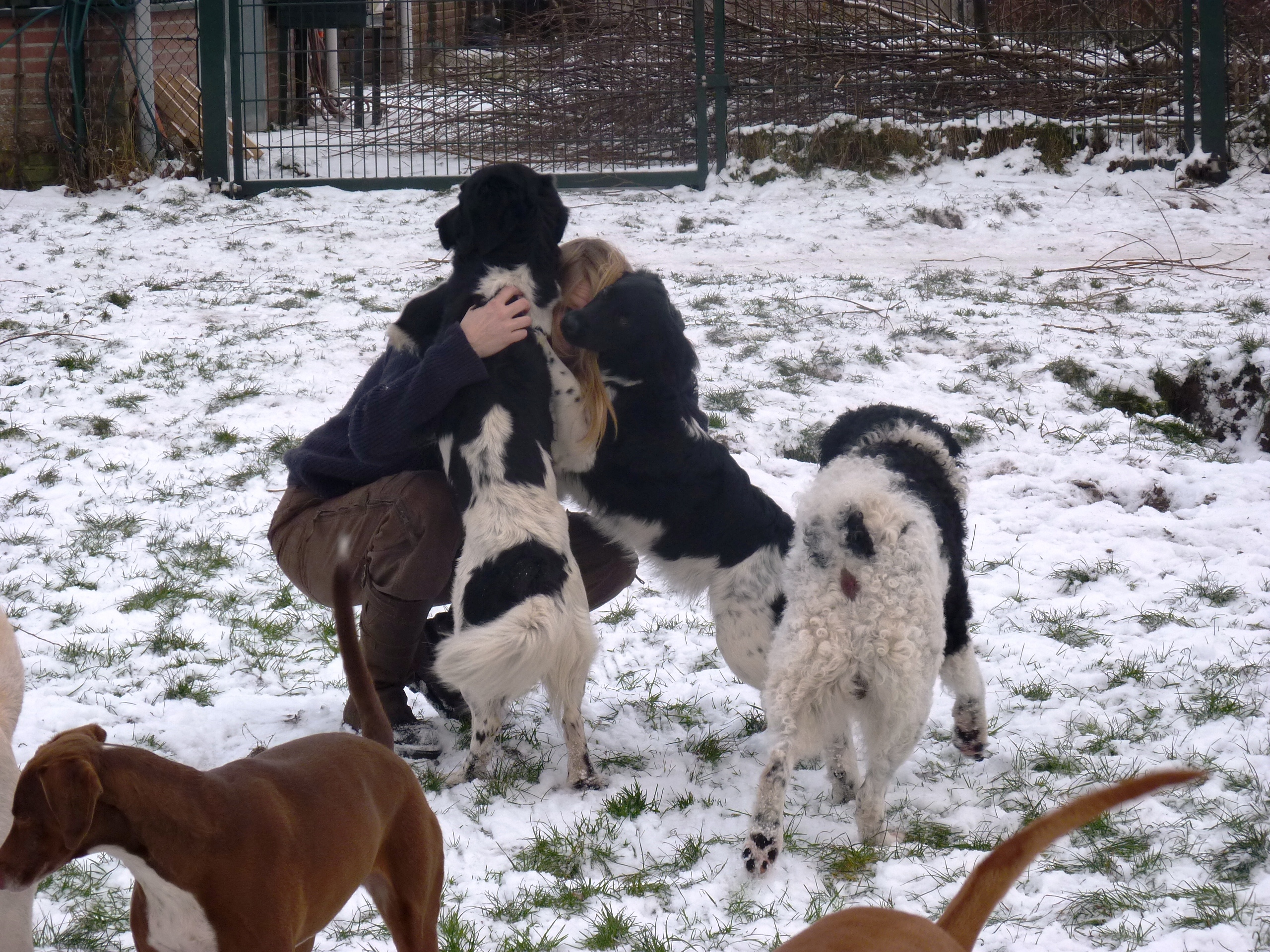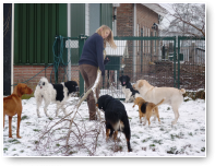 Eindelijk is het echt winter. Het vriest zelfs overdag en er ligt een lekkere laag sneeuw in het weiland. De meeste honden hebben wel wat met sneeuw en zijn (nog) uitgelatener dan anders. Sommige koukleumen zoeken regelmatig even een plekje binnen om bij te komen, sommige diehards blijven buiten zolang als ze kunnen, maar halverwege de dag halen we ze allemaal even 'verplicht' binnen om op te warmen en de ijsbolletjes tussen de tenen weg te laten smelten. De jonge kerels Willem en Biko werden vandaag scherp in de gaen gehouden door roedelleider Sietse, die zijn taak nog serieuzer begon te nemen toen Wetterhoun en 'rivaal' Jibbe binnenkwam. Ze gaan er een duobaan van maken, lijkt het: allebei te trots om het aan de ander te laten, en teveel 'heer' om er echt een punt van te maken. Het zijn goede honden, ze komen er wel uit. Jora mag morgen naar huis, en dat is lekker voor haar, ze begint moe te worden. Kleine Tammy heeft aan een stuk door gespeeld met Beagle Billy, dat zag er zo leuk uit! Vaste donderdaggasten Luna en Okke namen de boel regelmatig op sleeptouw vandaag, Flint doet lekker mee, maar laat het ook even weten als het hem te wild gaat - en dat mag natuurlijk. Al met al een mooie dag, kijk maar op de foto's.