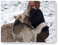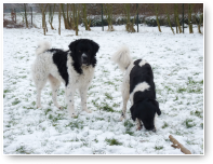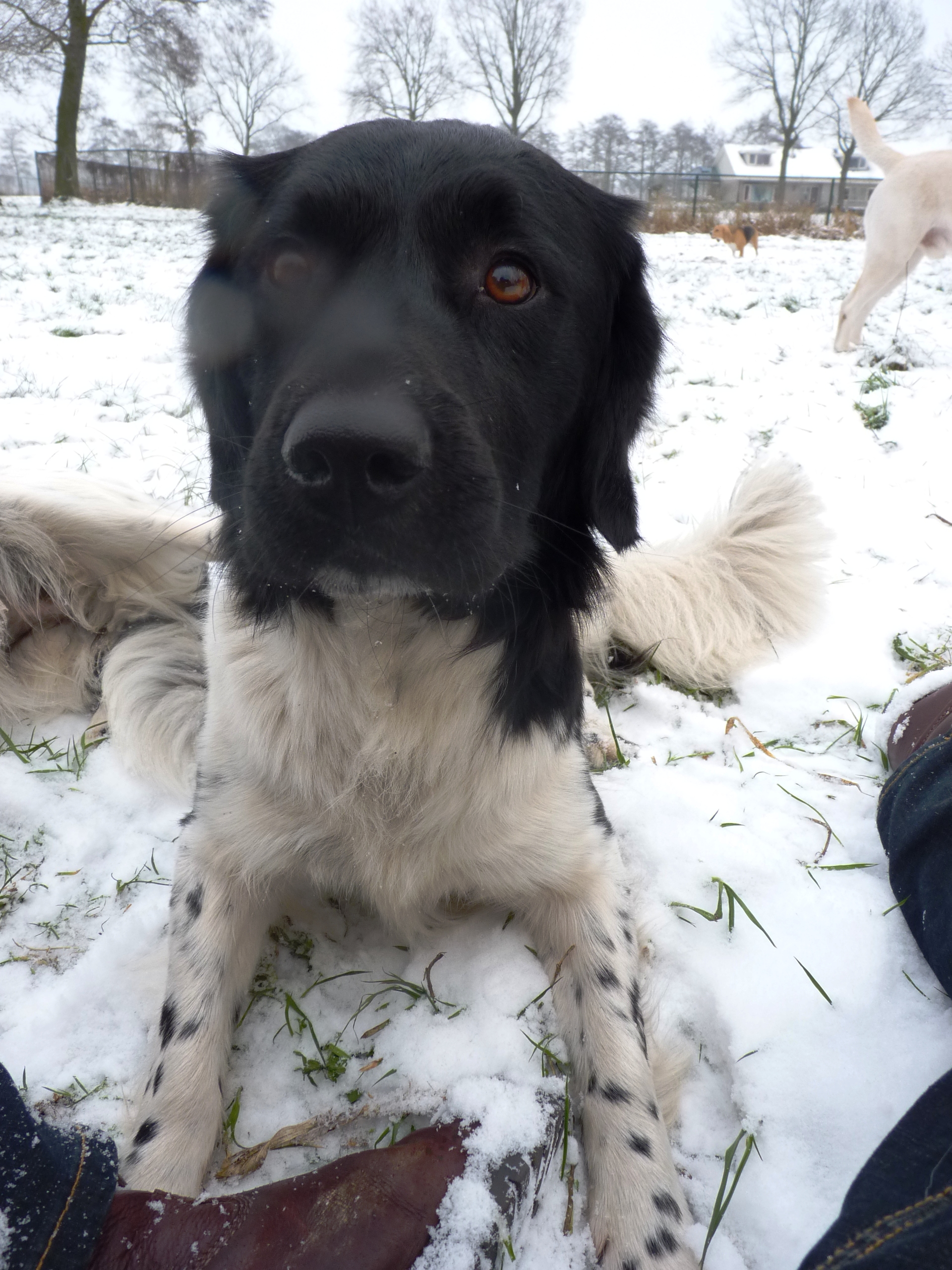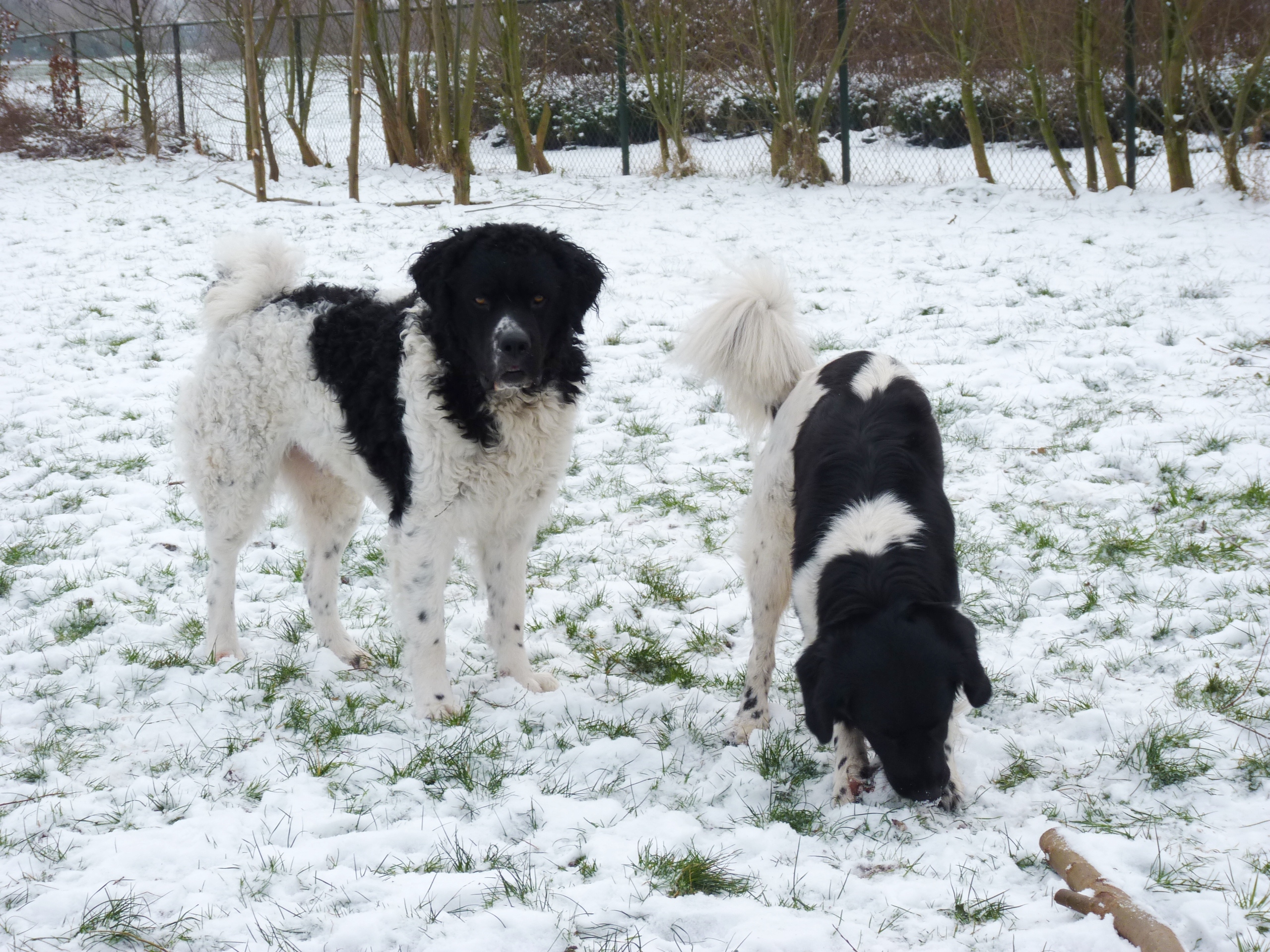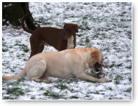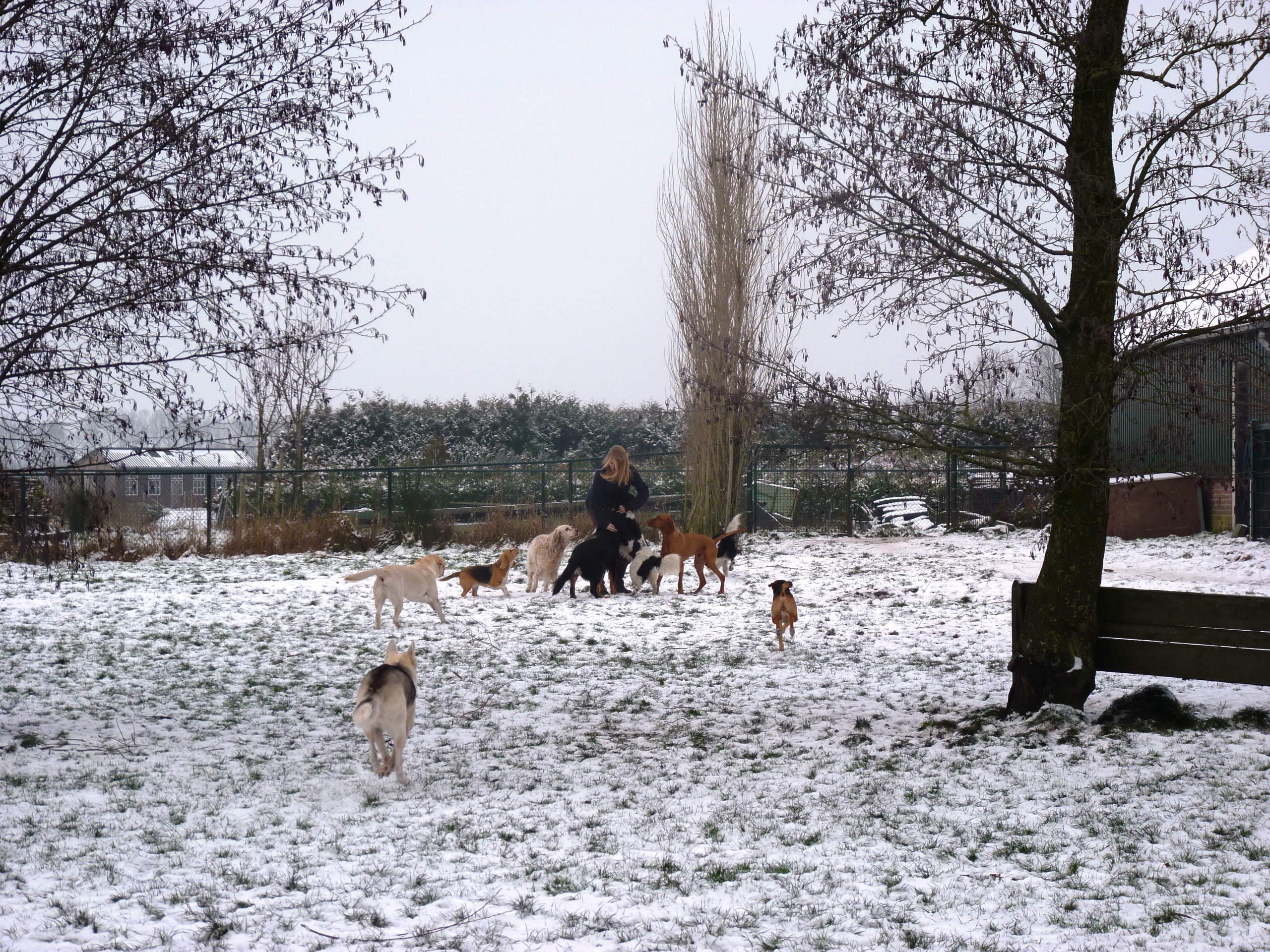 Eindelijk is het echt winter. Het vriest zelfs overdag en er ligt een lekkere laag sneeuw in het weiland. De meeste honden hebben wel wat met sneeuw en zijn (nog) uitgelatener dan anders. Sommige koukleumen zoeken regelmatig even een plekje binnen om bij te komen, sommige diehards blijven buiten zolang als ze kunnen, maar halverwege de dag halen we ze allemaal even 'verplicht' binnen om op te warmen en de ijsbolletjes tussen de tenen weg te laten smelten. De jonge kerels Willem en Biko werden vandaag scherp in de gaen gehouden door roedelleider Sietse, die zijn taak nog serieuzer begon te nemen toen Wetterhoun en 'rivaal' Jibbe binnenkwam. Ze gaan er een duobaan van maken, lijkt het: allebei te trots om het aan de ander te laten, en teveel 'heer' om er echt een punt van te maken. Het zijn goede honden, ze komen er wel uit. Jora mag morgen naar huis, en dat is lekker voor haar, ze begint moe te worden. Kleine Tammy heeft aan een stuk door gespeeld met Beagle Billy, dat zag er zo leuk uit! Vaste donderdaggasten Luna en Okke namen de boel regelmatig op sleeptouw vandaag, Flint doet lekker mee, maar laat het ook even weten als het hem te wild gaat - en dat mag natuurlijk. Al met al een mooie dag, kijk maar op de foto's.