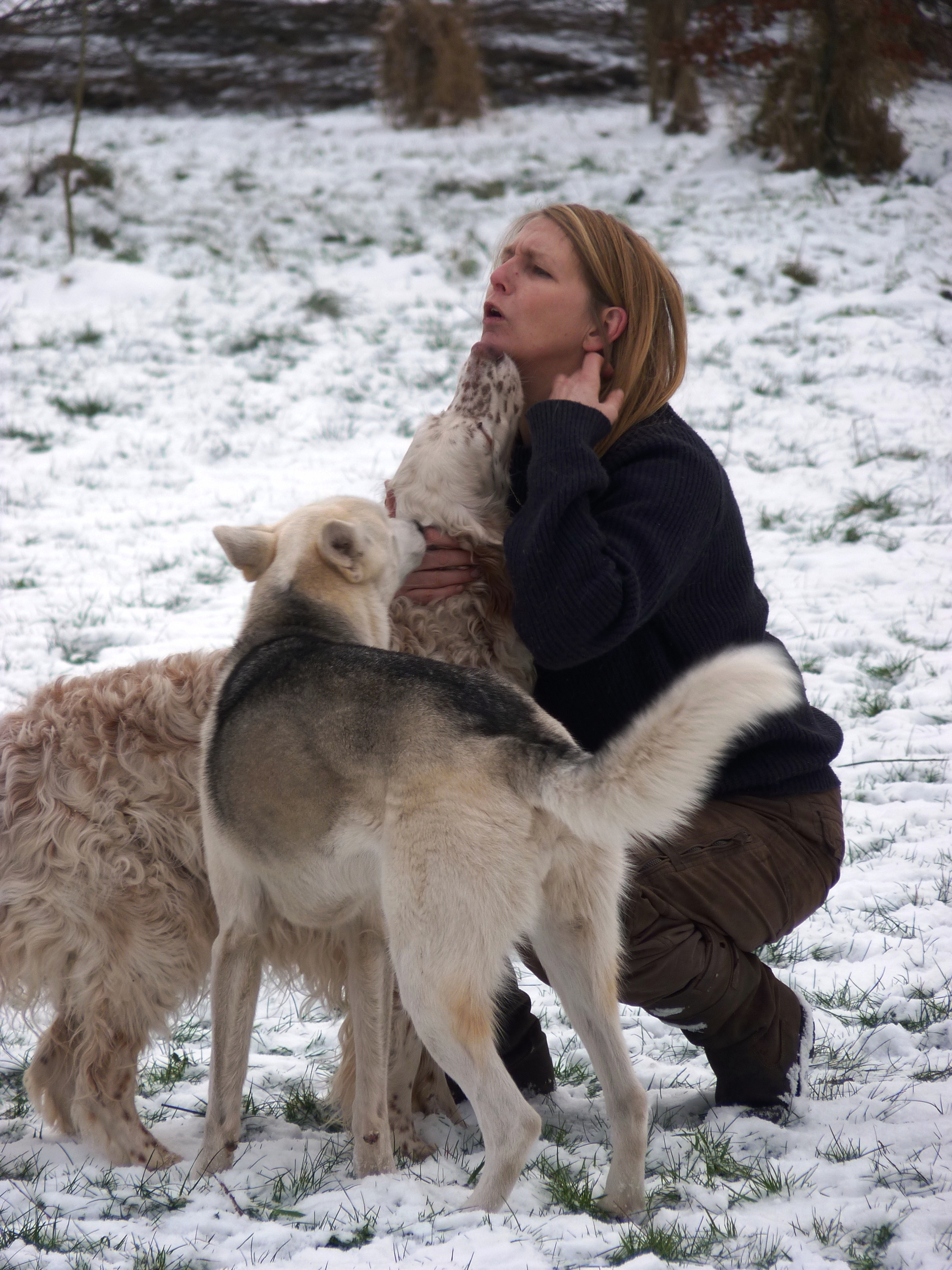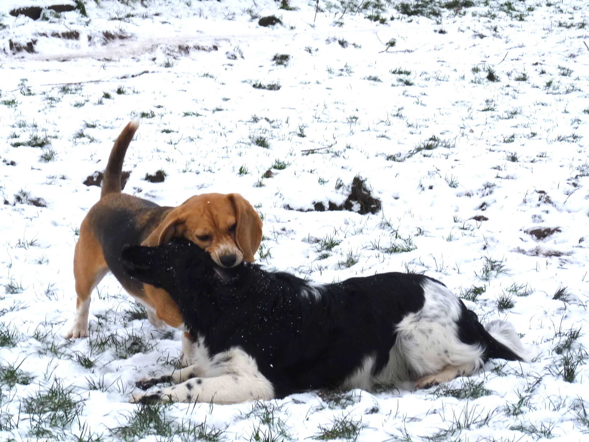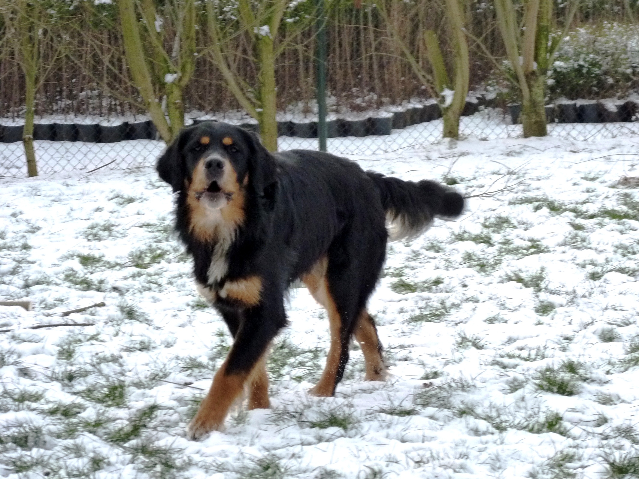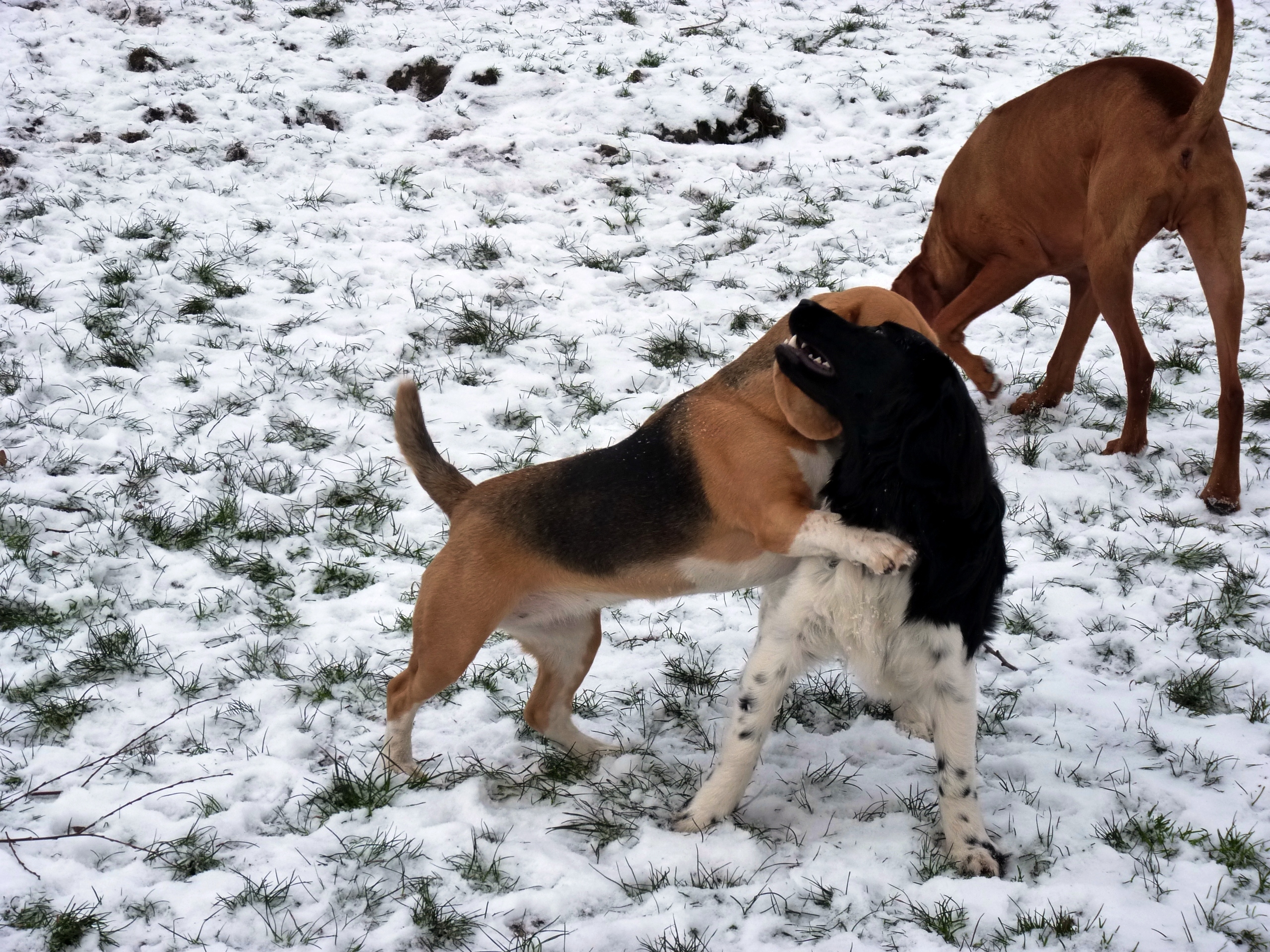 Eindelijk is het echt winter. Het vriest zelfs overdag en er ligt een lekkere laag sneeuw in het weiland. De meeste honden hebben wel wat met sneeuw en zijn (nog) uitgelatener dan anders. Sommige koukleumen zoeken regelmatig even een plekje binnen om bij te komen, sommige diehards blijven buiten zolang als ze kunnen, maar halverwege de dag halen we ze allemaal even 'verplicht' binnen om op te warmen en de ijsbolletjes tussen de tenen weg te laten smelten. De jonge kerels Willem en Biko werden vandaag scherp in de gaen gehouden door roedelleider Sietse, die zijn taak nog serieuzer begon te nemen toen Wetterhoun en 'rivaal' Jibbe binnenkwam. Ze gaan er een duobaan van maken, lijkt het: allebei te trots om het aan de ander te laten, en teveel 'heer' om er echt een punt van te maken. Het zijn goede honden, ze komen er wel uit. Jora mag morgen naar huis, en dat is lekker voor haar, ze begint moe te worden. Kleine Tammy heeft aan een stuk door gespeeld met Beagle Billy, dat zag er zo leuk uit! Vaste donderdaggasten Luna en Okke namen de boel regelmatig op sleeptouw vandaag, Flint doet lekker mee, maar laat het ook even weten als het hem te wild gaat - en dat mag natuurlijk. Al met al een mooie dag, kijk maar op de foto's.
