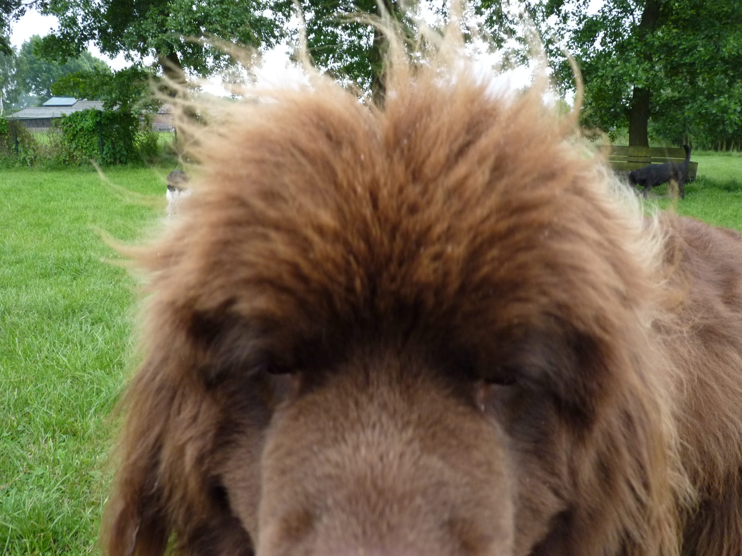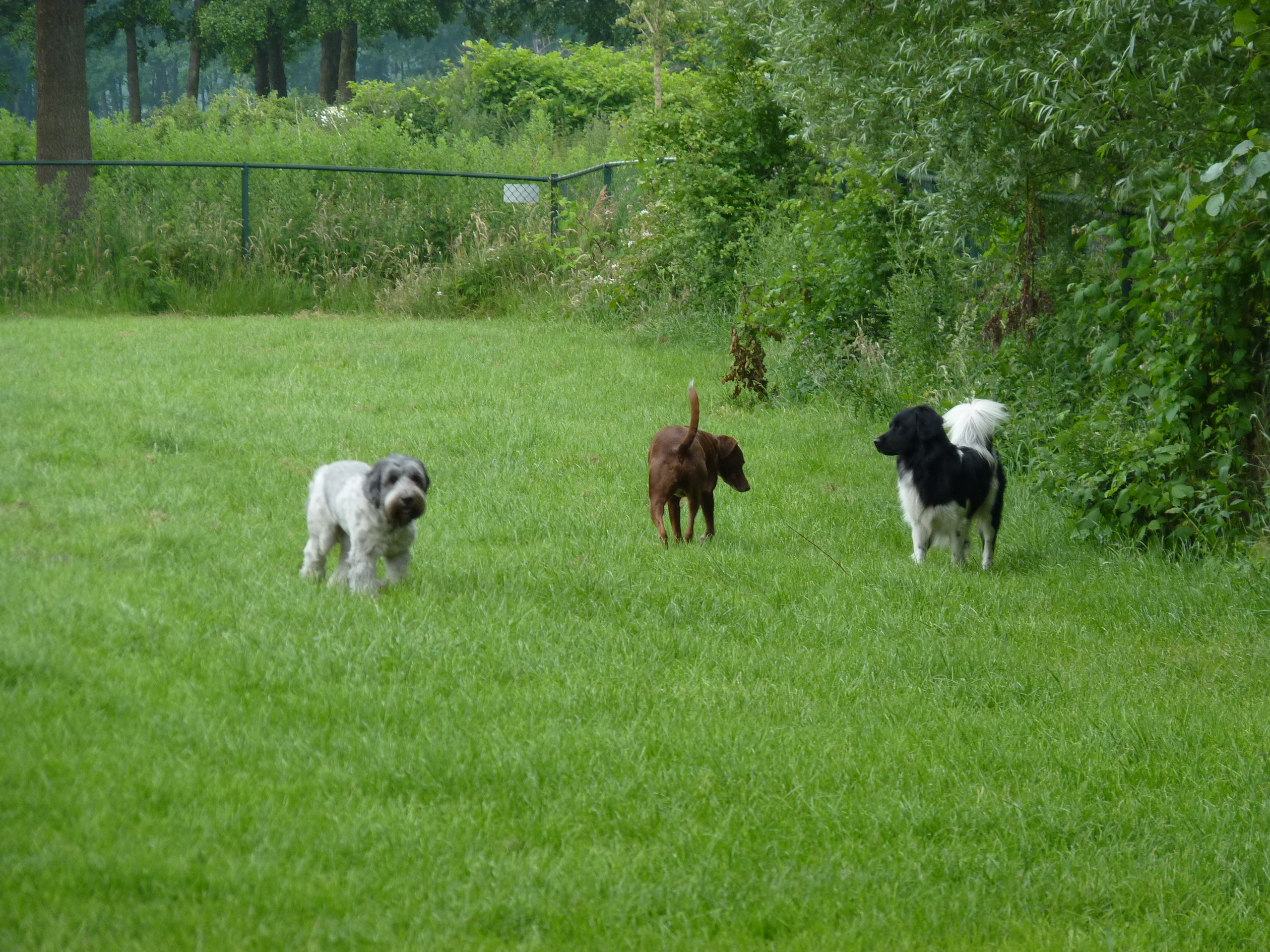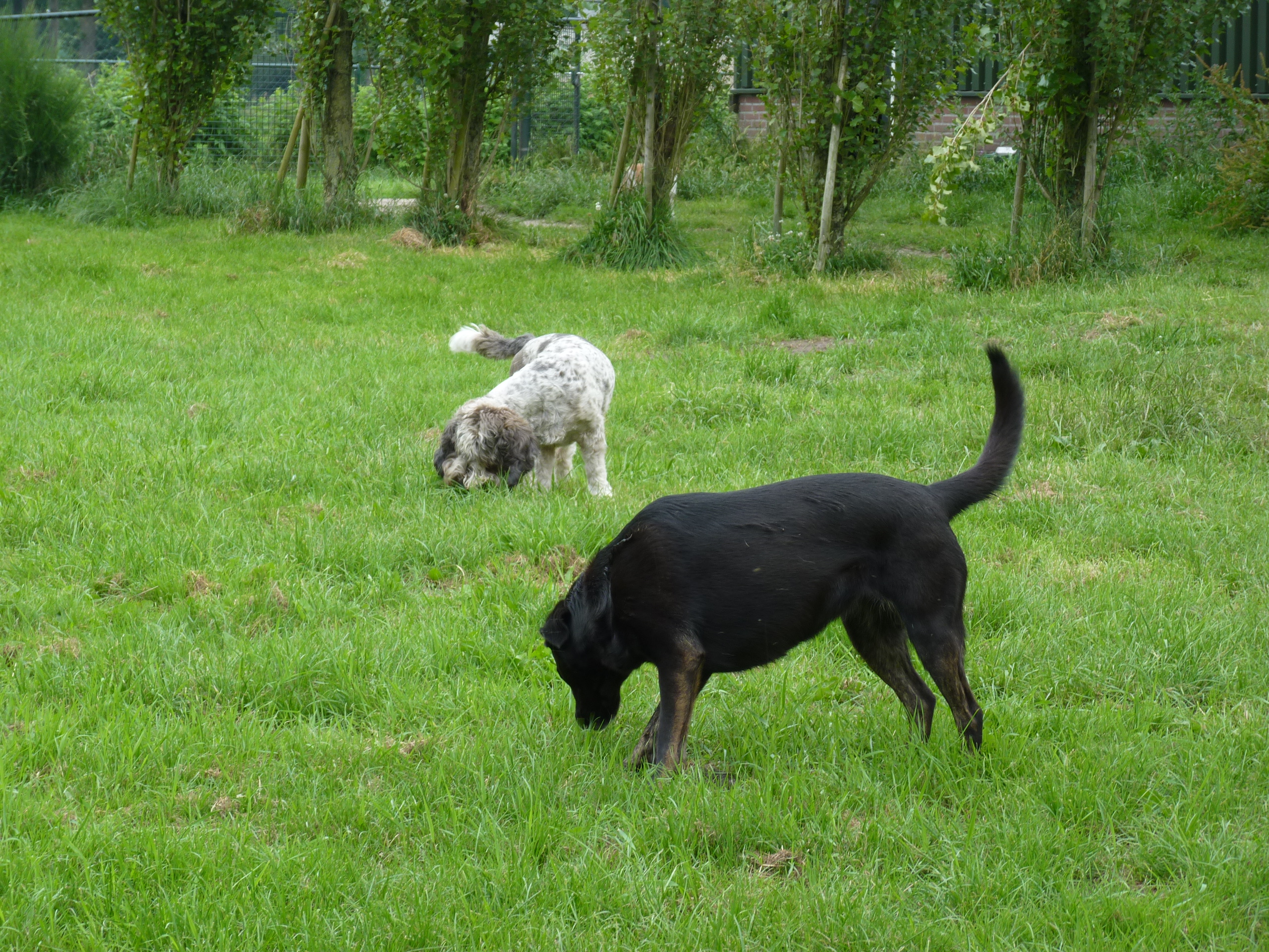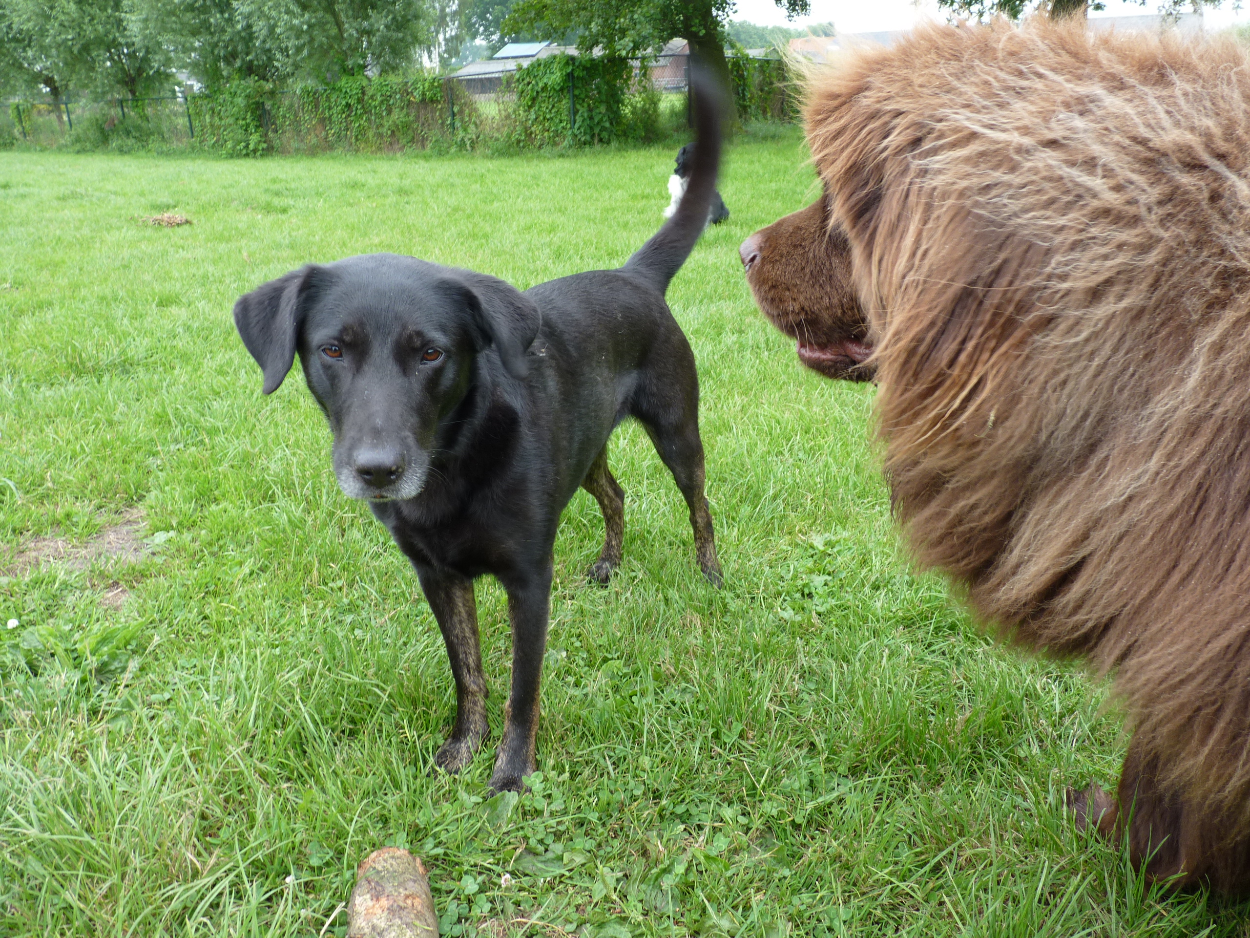 Het is een prachtig, gevarieerd gezelschap dat logeert. Naast de gebruikelijke Labradors en Friese Stabij's lopen er de meest uiteenlopende rassen door elkaar. De kleintjes Boemer, Gijs en Boros hebben elkaar echt gevonden en zoeken elkaar steeds op. New Foundlander Oscar en Gucci Tatrahond zijn de grootsten van de groep. Alles gaat vredig met elkaar om. Er is wel de hele dag leven in de brouwerij maar de Labradors houden de boel wel aan de gang. Helaas ging het vrij snel regenen tijdens het fotograferen dus ik heb nog niet de hele roedel compleet. Ik plaats vast de foto's die ik heb 'gescoord', de rest volgt!