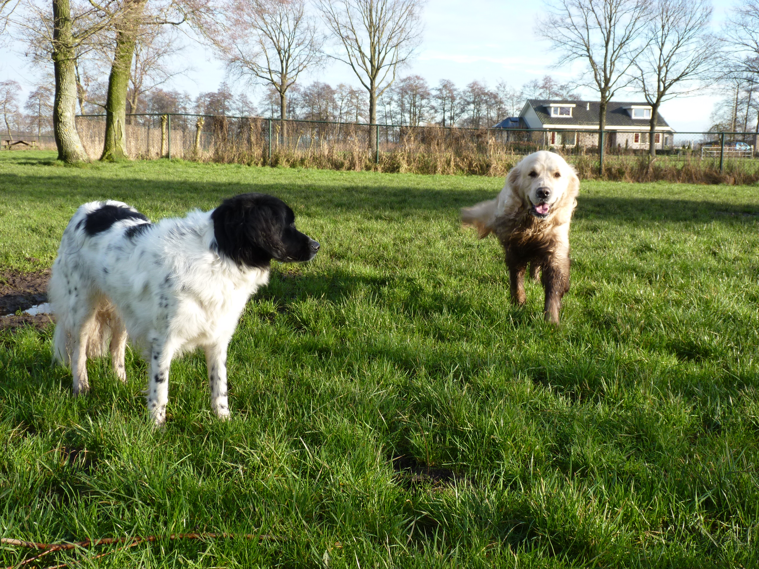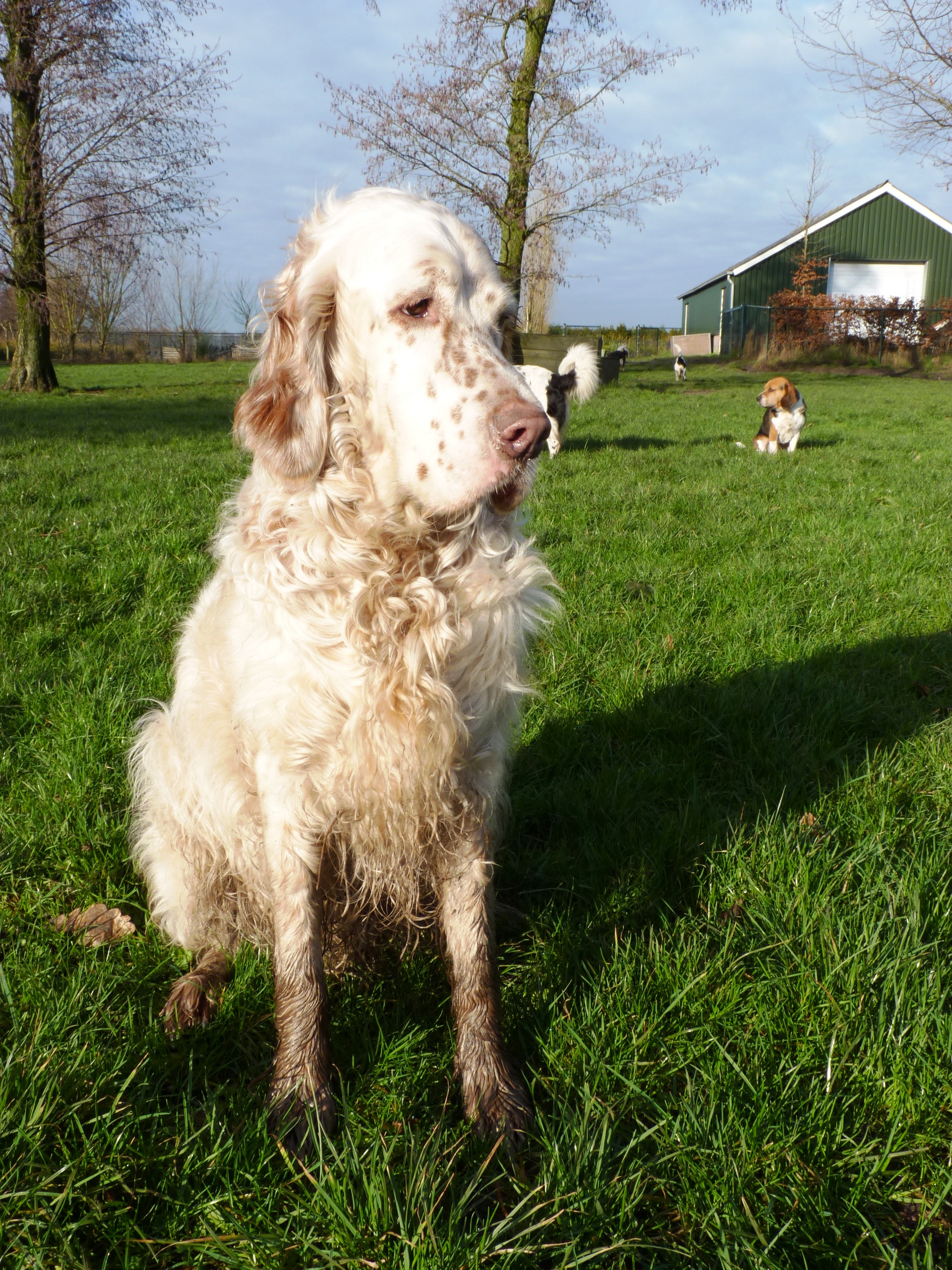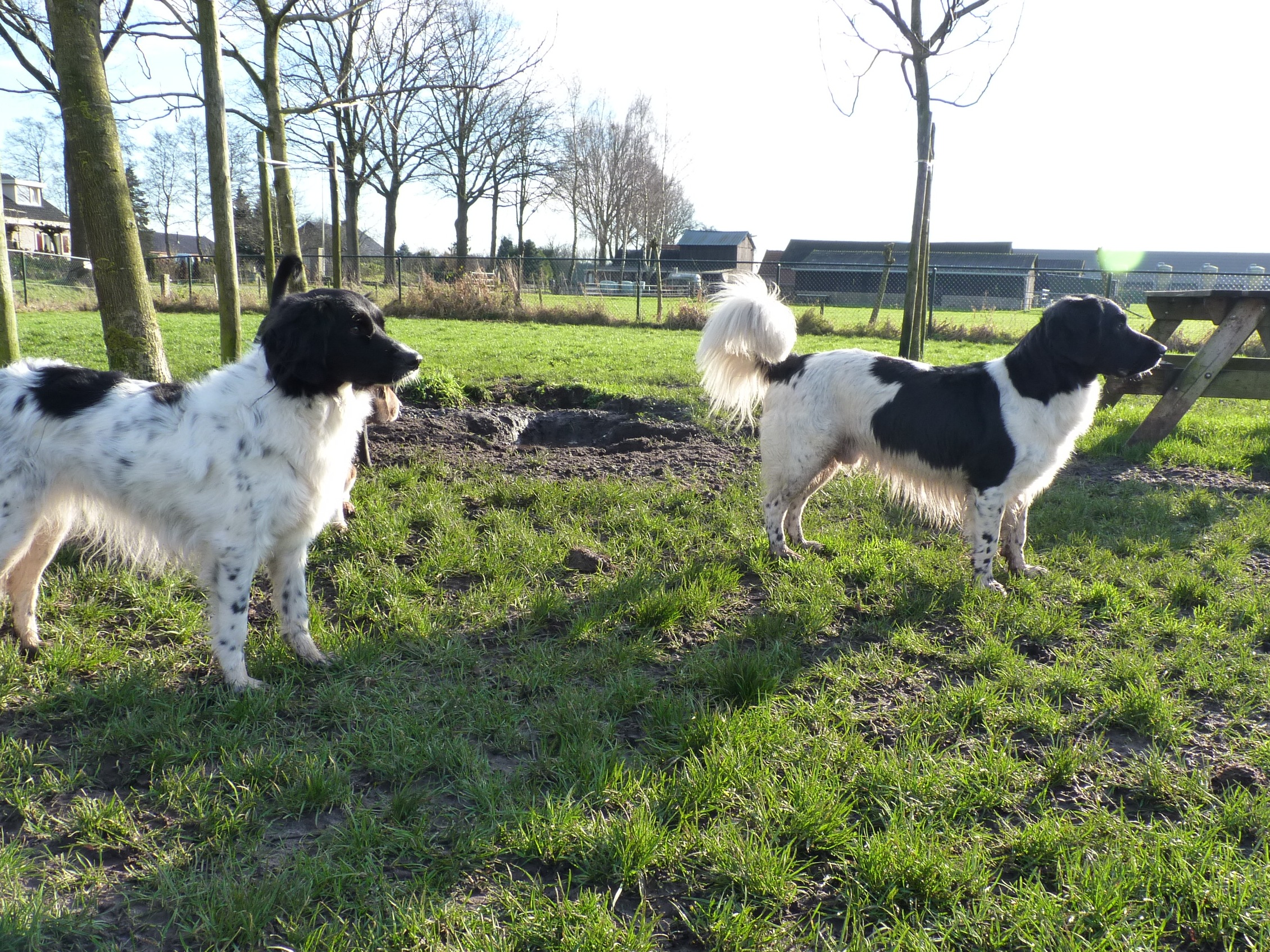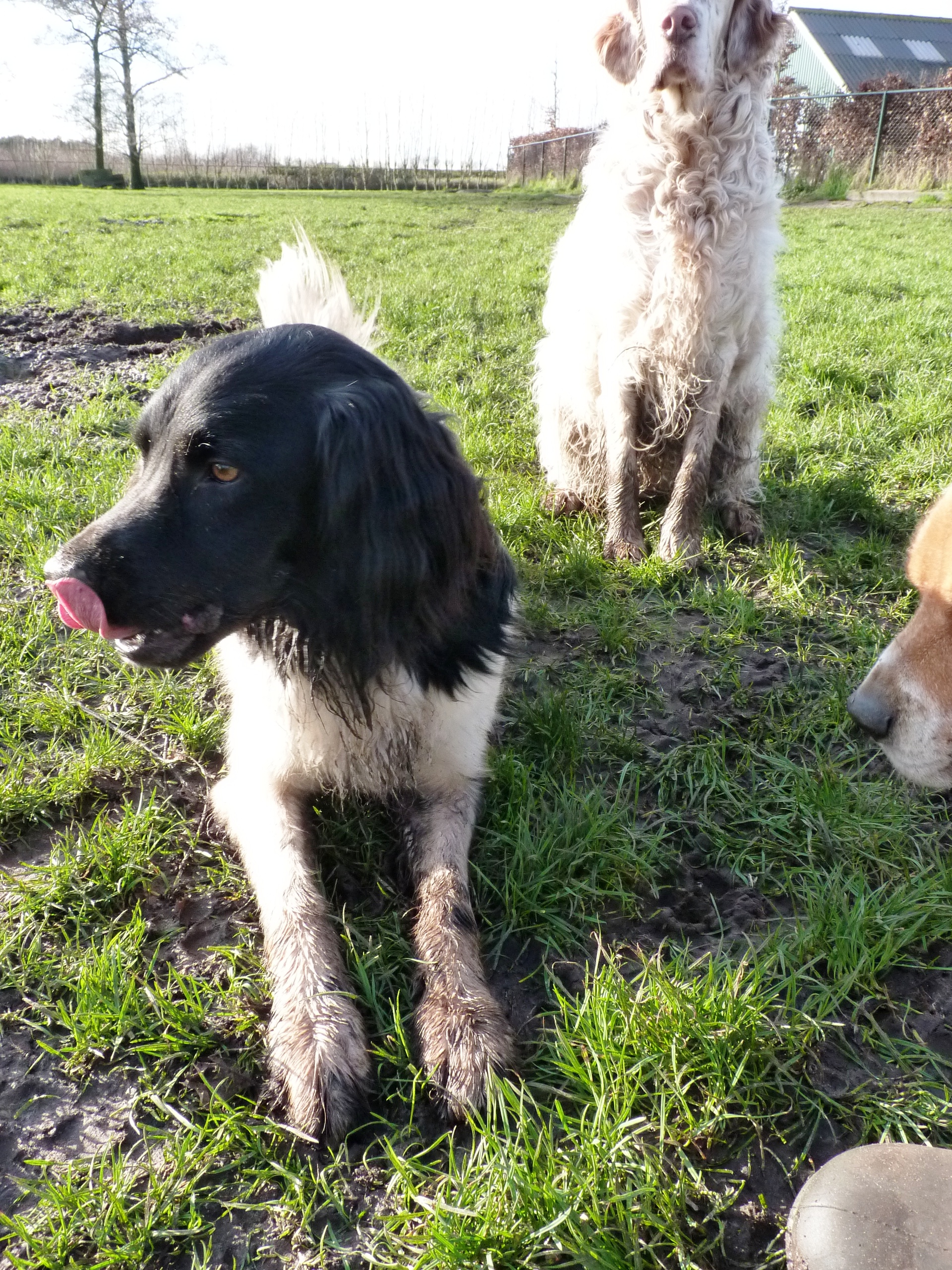 Hoog tijd voor een nieuw dagboek. Er schijnt een winterzonnetje, en het kleine clubje honden dat bij ons logeert geniet er van. Kleine Stabij Wytse is hier al een week, en hij begint een beetje aan het eind van z'n Latijn te raken. We laten hem veel slapen, en nemen hem af en toe mee de wei in, tussen de andere honden. Dat vindt hij heerlijk. Het is een leuk, dapper hondje, en hij speelt vrijuit met de grote jongens en meisjes. Het is ook niet niks voor zo'n kereltje, hij heeft een boel meegemaakt en geleerd in dat weekje. Engelse Setter Jora is in haar element. Ze maakt flink wat kilometers op een dag, en leeft zich helemaal uit - dat wordt schrobben als ze straks thuiskomt. Senna is een kruising Labrador/Entlebucher, ook al zo'n levensgenieter. Golden Retriever Bink is hier voor het eerst, maar hij heeft het al helemaal door en dat zie je aan hem. Hij doet niet onder voor ervaren Stabij's als Sietse, maffe Donny en good old Bob, of vaste dagklanten Joris, Sam en Beagle Guus. Stabijdame Beike, tenslotte, scharrelt overal tussendoor, staat regelmatig even heel lief in de verte te kijken en laat zich graag aanhalen. Heerlijk hoor, zo'n gemoedelijk roedeltje, zonnetje er bij, wat een naar leven hebben we toch