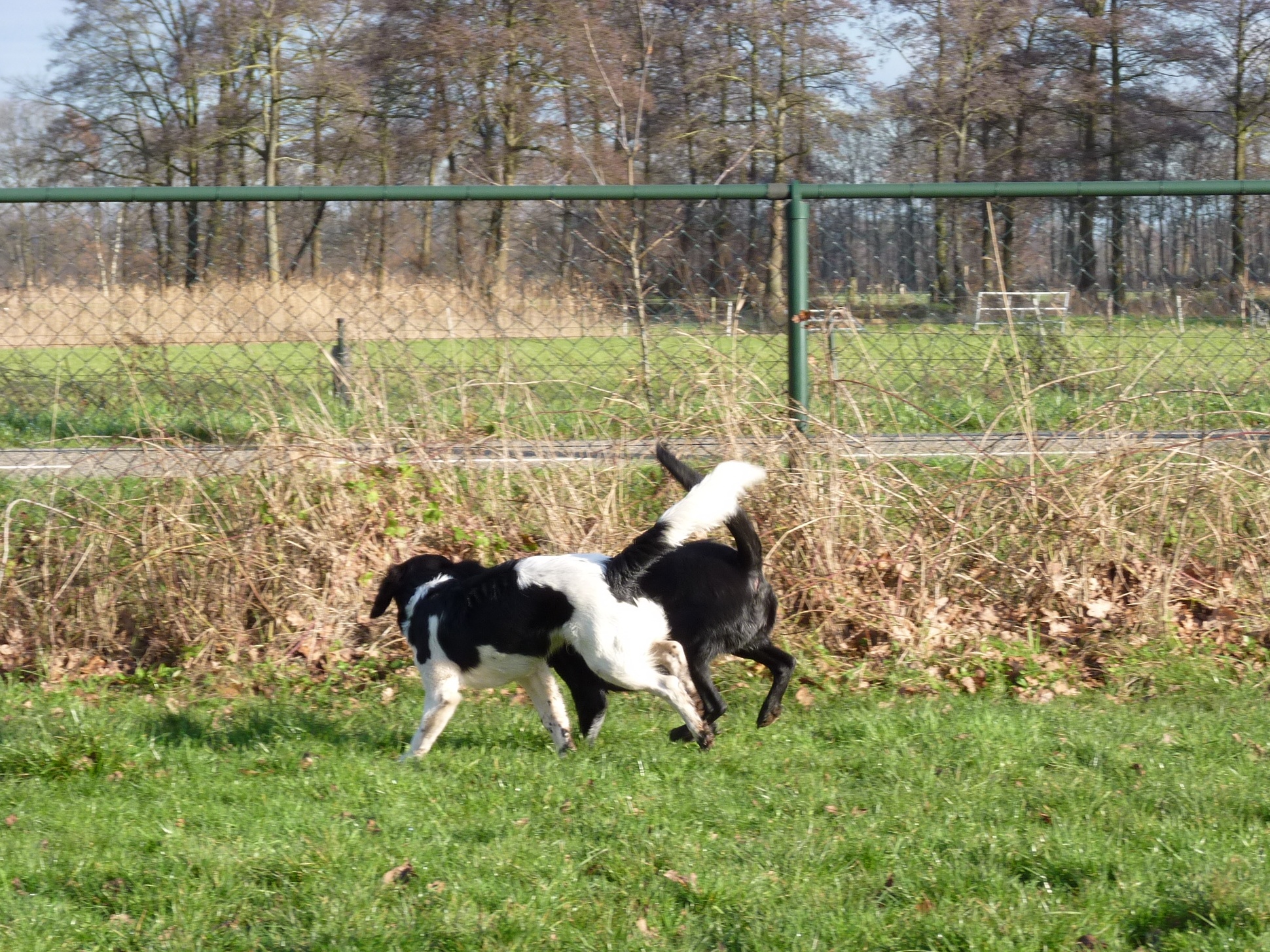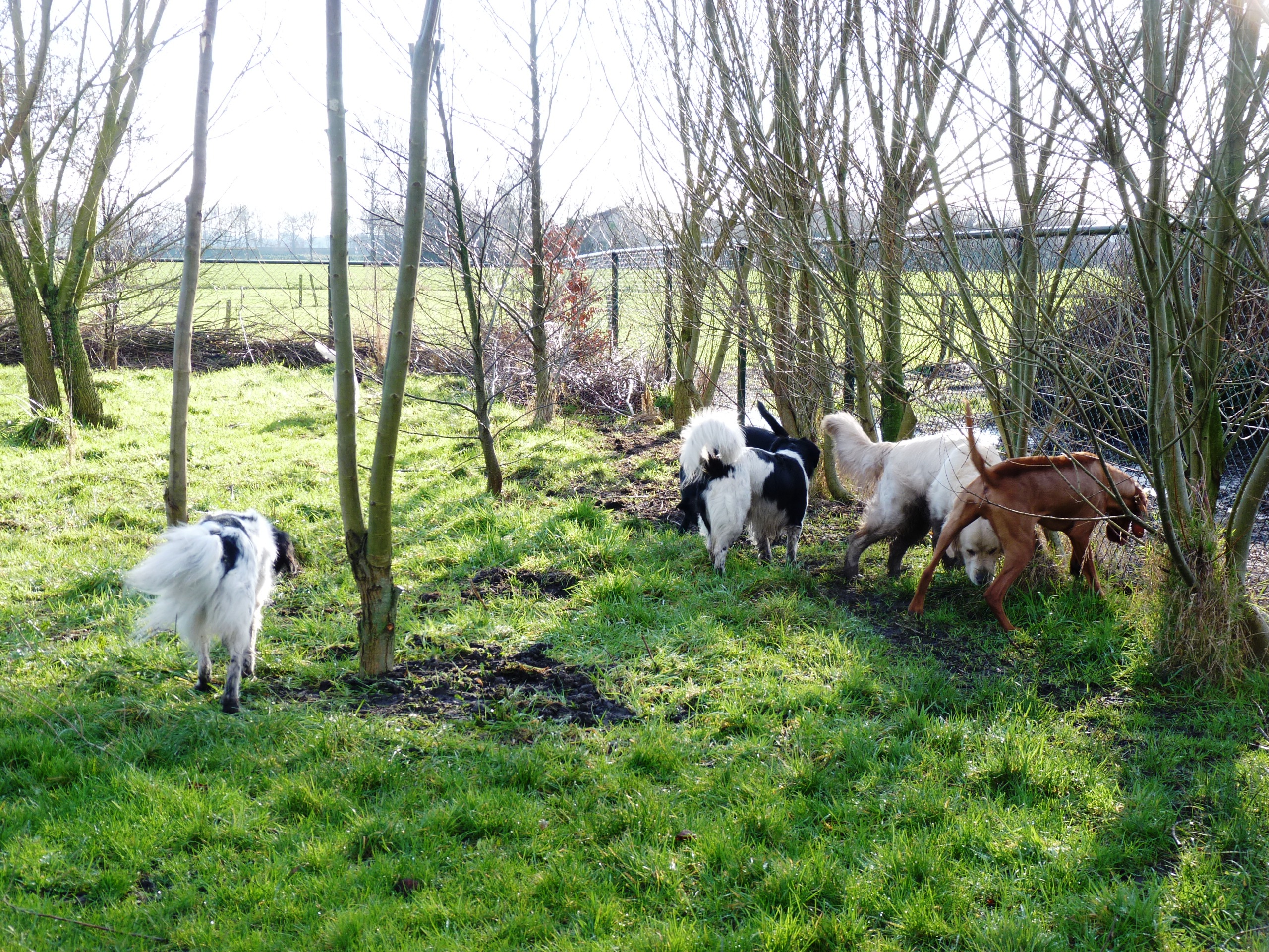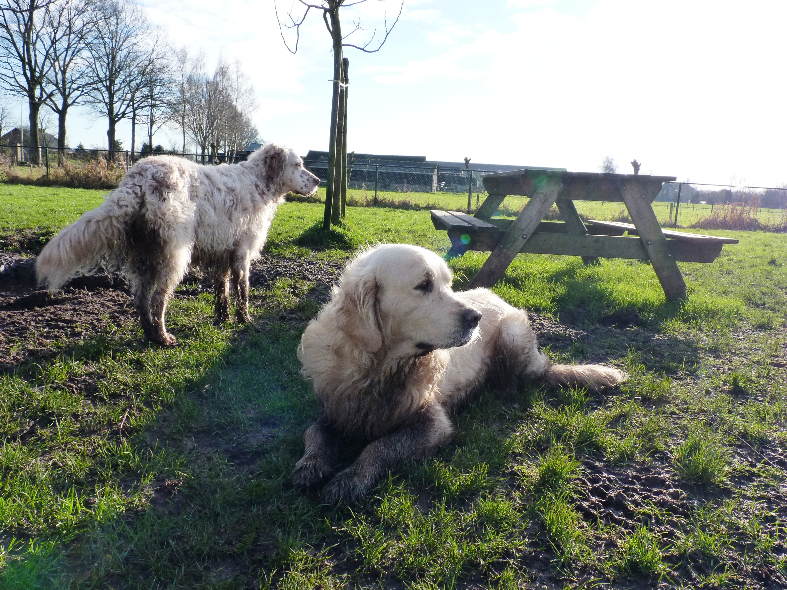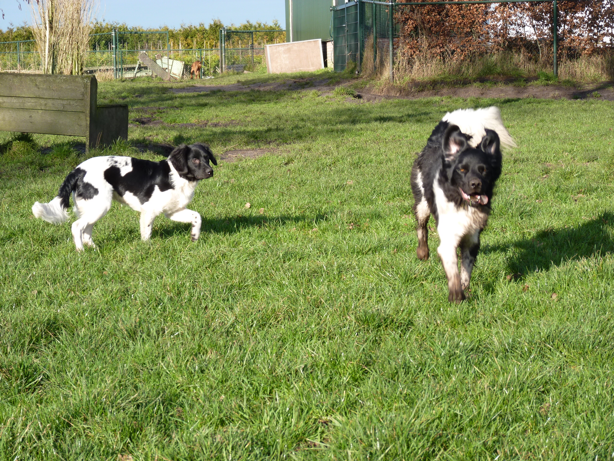 Hoog tijd voor een nieuw dagboek. Er schijnt een winterzonnetje, en het kleine clubje honden dat bij ons logeert geniet er van. Kleine Stabij Wytse is hier al een week, en hij begint een beetje aan het eind van z'n Latijn te raken. We laten hem veel slapen, en nemen hem af en toe mee de wei in, tussen de andere honden. Dat vindt hij heerlijk. Het is een leuk, dapper hondje, en hij speelt vrijuit met de grote jongens en meisjes. Het is ook niet niks voor zo'n kereltje, hij heeft een boel meegemaakt en geleerd in dat weekje. Engelse Setter Jora is in haar element. Ze maakt flink wat kilometers op een dag, en leeft zich helemaal uit - dat wordt schrobben als ze straks thuiskomt. Senna is een kruising Labrador/Entlebucher, ook al zo'n levensgenieter. Golden Retriever Bink is hier voor het eerst, maar hij heeft het al helemaal door en dat zie je aan hem. Hij doet niet onder voor ervaren Stabij's als Sietse, maffe Donny en good old Bob, of vaste dagklanten Joris, Sam en Beagle Guus. Stabijdame Beike, tenslotte, scharrelt overal tussendoor, staat regelmatig even heel lief in de verte te kijken en laat zich graag aanhalen. Heerlijk hoor, zo'n gemoedelijk roedeltje, zonnetje er bij, wat een naar leven hebben we toch